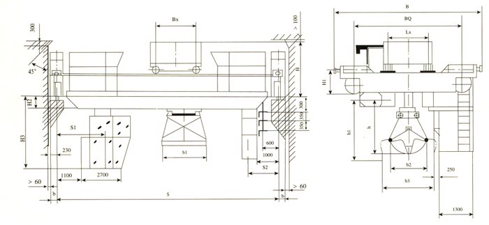 本機(jī)由箱形橋架、大車運(yùn)行機(jī)構(gòu)、小車、抓斗、電氣設(shè)備五部分組成,全部機(jī)構(gòu)均在操縱室內(nèi)操縱。