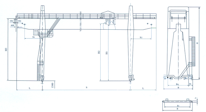 二、起重機(jī)有橋架、大車運(yùn)行機(jī)構(gòu)、小車、電器設(shè)備等組成。橋架采用箱型雙梁焊接結(jié)構(gòu),大車運(yùn)行機(jī)構(gòu)采用分別驅(qū)動(dòng),全部機(jī)構(gòu)均在操縱室操縱。